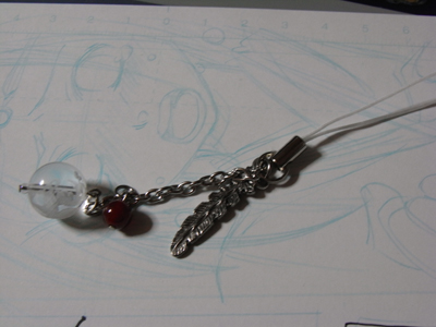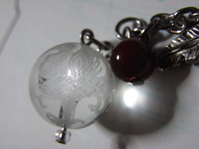 ロジウムの鳥の羽チャームと、赤い天然石…メノウだったかな。それと下のが水晶の玉で、朱雀が手彫りしてあるんです。